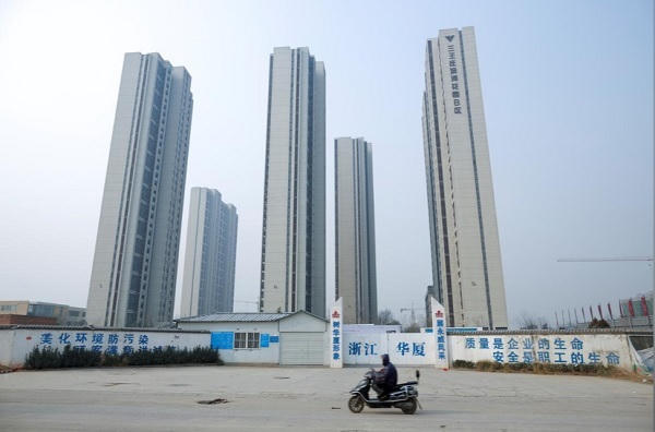Một người đàn ông đi ngang qua những khu nhà cao tầng mới xây gần sân vận động mới ở Trịnh Châu, tỉnh Hà Nam
