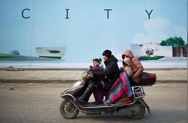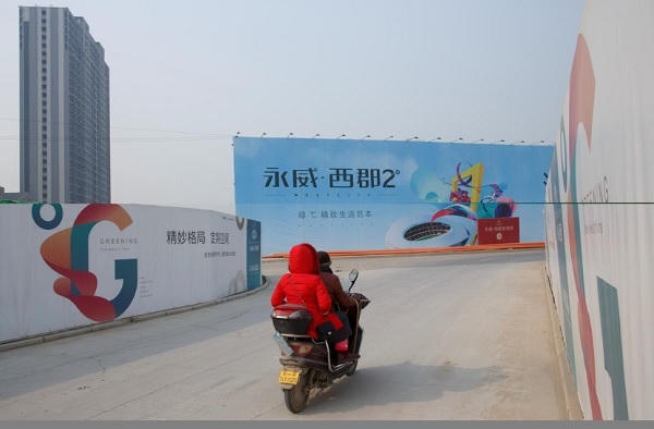 Một gia đình lái xe ngang qua một biển quảng về khu căn hộ phức hợp gần sân vận động mới ở Trịnh Châu, tỉnh Hà Nam