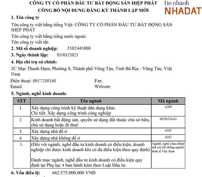 Liên quan đến chủ đầu tư dự án, theo tìm hiểu của người viết, Công ty Bất động sản Hiệp Phát được thành lập ngày 5/1/2021, có trụ sở tại 2C, Mạc Thanh Đạm, phường 8, TP Vũng Tàu. Tại thời điểm thành lập, doanh nghiệp có vốn điều lệ hơn 662,5 tỷ đồng. Bao gồm ba cổ đông sáng lập: Nguyễn Ngọc Huyền My (48,81%), Lê Thị Huyền Trang (25%), Lại Thế Hà, Tổng Giám đốc của Hiệp Phát (26,18%).