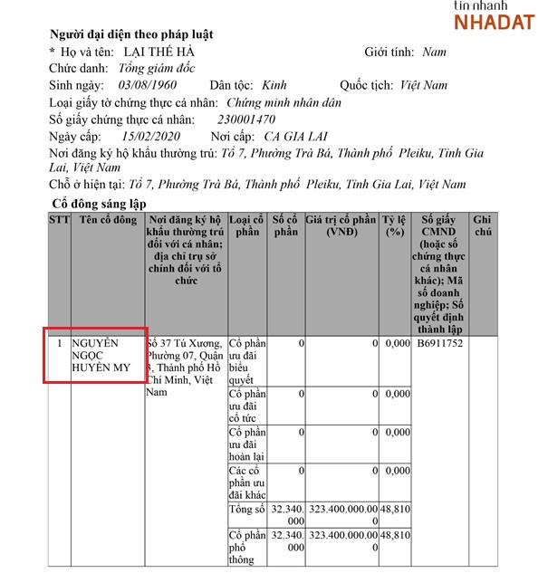 Đáng chú ý, trong danh sách cổ đông của công ty, bà Nguyễn Ngọc Huyền My là con gái của bà Nguyễn Thị Như Loan – Tổng Giám đốc của CTCP Quốc Cường Gia Lai (Mã: QCG). Ông Lại Thế Hà hiện đang giữ chức vụ Phó Tổng Giám đốc kiêm Chủ tịch HĐQT của QCG.