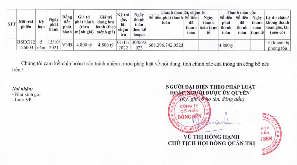 Theo Sở Giao dịch Chứng khoán Hà Nội (HNX), CTCP Bông Sen (Bông Sen Corp) vừa công bố tình hình thanh toán gốc và lãi trái phiếu trong nửa đầu năm 2023. Theo đó, ông lớn trong lĩnh vực nhà hàng khách sạn đã không thanh toán 4.800 tỷ đồng gốc trái phiếu và hơn 668 tỷ đồng lãi. Lý do mà Bông Sen đưa ra là do “tài khoản bị phong tỏa”.