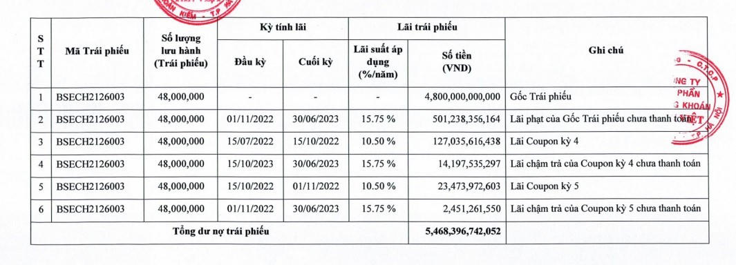 Lô trái phiếu có mã BSECH2126003 được phát hành ngày 15/10/2021 với kỳ hạn 5 năm. Ngày thanh toán theo kế hoạch là 30/6/2023. Số tiền gốc phải thanh toán là 4.800 tỷ đồng. Lãi và lãi phạt phải thanh toán là hơn 668 tỷ đồng. Doanh nghiệp này đã chậm thanh toán gốc và lãi trong kỳ.