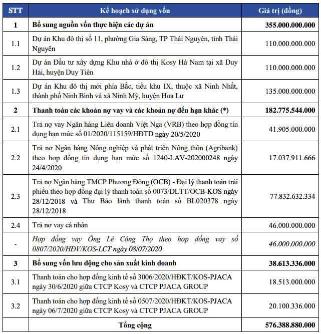 Số tiền thu về được Kosy dùng để trả nợ ngân hàng và đầu tư bất động sản. Cụ thể, Kosy dự kiến rót 335 tỷ đồng cho 3 dự án tại Thái Nguyên, Hà Nam và Ninh Bình. Còn lại 183 tỷ đồng sẽ được dùng để thanh toán các khoản nợ vay, nợ đến hạn các ngân hàng: Phương Đông (hơn 77 tỷ đồng), Liên doanh Việt Nga (gần 42 tỷ đồng), Agribank (17 tỷ đồng). Số tiền gần 39 tỷ đồng còn lại sẽ được bổ sung vào vốn lưu động để thanh toán hai hợp đồng giữa Kosy và Công ty cổ phần Pjica Group.