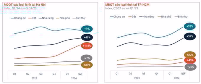 Theo thống kê ghi nhận ở hai thị trường BĐS lớn nhất cả nước là Hà Nội và TP. HCM, đa phần các loại hình BĐS đều cho thấy mức độ tìm kiếm tăng trưởng tích cực ở quý I và quý II/2024.