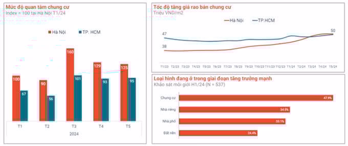 Theo thống kê của Batdongsan.com.vn, nếu đặt mốc từ tháng 10/2023, lượt tìm kiếm chung cư đạt đỉnh vào tháng 3/2024 và tính đến tháng 5/2024, lượt tìm kiếm tăng 29% tại Hà Nội và 32% tại TP. HCM.