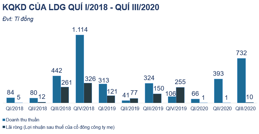 Đồng thời Lũy kế 9 tháng đầu năm 2020, LDG đạt 1.191 tỉ đồng doanh thu thuần và gần 13 tỉ đồng ròng, tăng 75% về doanh thu nhưng giảm 96% về lợi nhuận.