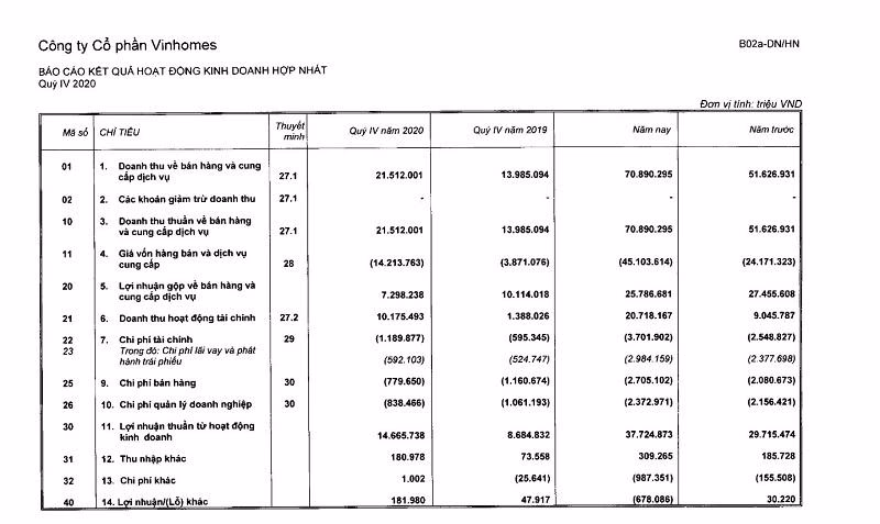 Còn tổng doanh thu thuần hợp nhất ghi nhận trong năm 2020 của Vinhomes đạt 70.890 tỷ đồng, tăng 37% so với cùng kỳ năm 2019. Tổng doanh thu thuần hợp nhất quy đổi ghi nhận trong năm 2020, bao gồm doanh thu từ các hoạt động của Vinhomes, các hợp đồng hợp tác kinh doanh (BCC) và hoạt động bán buôn được ghi nhận như một khoản thu nhập tài chính, đạt 98.089 tỷ đồng, tăng 43% so với năm 2019.