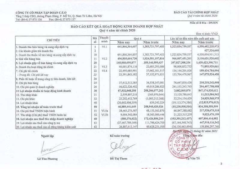 Được biết, trong năm 2020, CEO Group đặt kế hoạch doanh thu là 3.000 tỷ đồng, lợi nhuận sau thuế là 200 tỷ đồng, lần lượt giảm 35,2% và 67,1% so với năm 2019. Như vậy, với việc lỗ 103 tỷ đồng cả năm 2020, kết quả kinh doanh của doanh nghiệp ở mức rất xa kế hoạch đề ra.