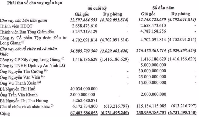 Theo đó, đối với nhóm vay có tài sản đảm bảo, khoản vay của ông Mai Thanh Phương và bà Nguyễn Thị Huế đều được bảo đảm bằng cổ phiếu Long Giang E&C.