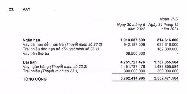 Cụ thể, tính đến ngày 30/6/2022, tổng nợ vay của Nhà Khang Điền tăng gần 3.210 tỷ đồng so với đầu năm lên mức 5.762,4 tỷ đồng, tương đương tăng 127,8%.