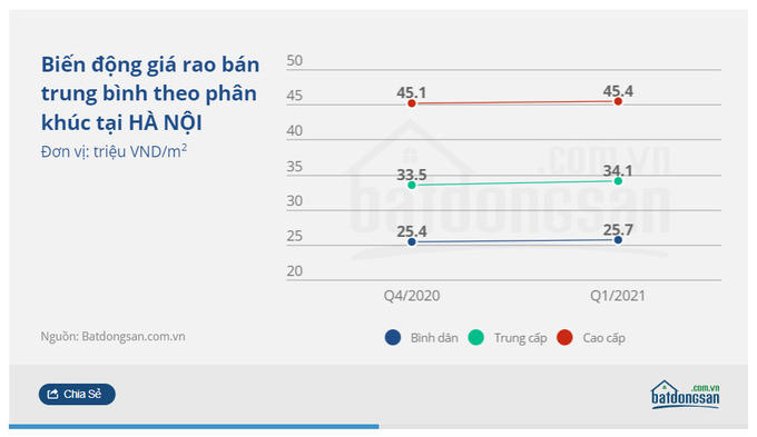 Theo dữ liệu của Batdongsan.com, giá BĐS trong quý I cũng tăng liên tục tại các thành phố lớn như Hà Nội, TPHCM. Riêng Hà Nội, giá căn hộ bán và cho thuê tăng trung bình 5 - 8% theo quý. Còn đất nền, đất thổ cư tăng trung bình 20 - 25% so với cùng kỳ. Tại TP HCM, mặt bằng giá bán căn hộ tăng gần 10% so với cùng kỳ; đất nền, đất thổ cư rao bán tăng 10 - 25%.