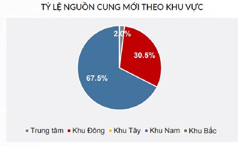 Xét theo khu vực, nguồn cung mới trong tháng sụt giảm, nhiều dự án dự định mở bán phải dời lại để hoàn thành các thủ tục pháp lý theo quy định. Cụ thể, khu Nam vươn lên trở thành tâm điểm thị trường với khoảng 519 căn mở bán, chiếm 67.5% tổng nguồn cung mới; khu Đông chiếm 30.5% với khoảng 235 căn, giảm mạnh so với 1,440 căn mở bán ghi nhận ở tháng trước; khu vực Trung tâm chiếm 2.0% với khoảng 15 căn hộ mở bán. Trong khi đó khu Tây và khu Bắc không ghi nhận có dự án mở bán.