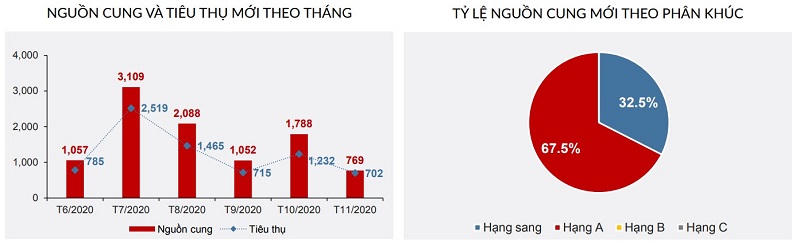 Đồng thời xét theo phân khúc, tại TP Hồ Chí Minh trong tháng 11/2020 ghi nhận có 3 dự án mở bán (1 dự án mới và 2 giai đoạn tiếp theo của dự án đã mở bán trước đó), cung cấp ra thị trường khoảng 769 căn, bằng 43.0% của T10/2020 (1,788 căn). Tỷ lệ tiêu thụ đạt khoảng 91.3% trên nguồn cung mới (702 căn), bằng 57.0% tháng trước (1,232 căn).