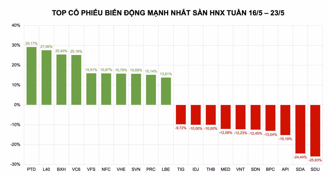 Trên sàn HNX, 10 cổ phiếu tăng mạnh nhất tuần gồm: L40 (+36,10%), VC6 (+25,79%), BXH (+25,40%), PRC (+19,27%), PTD (+18,75%), NFC (+15,87%), VFS (+14,09%), LBE (+13,81%), VHE (+10,53%) và DST (+10,17%).