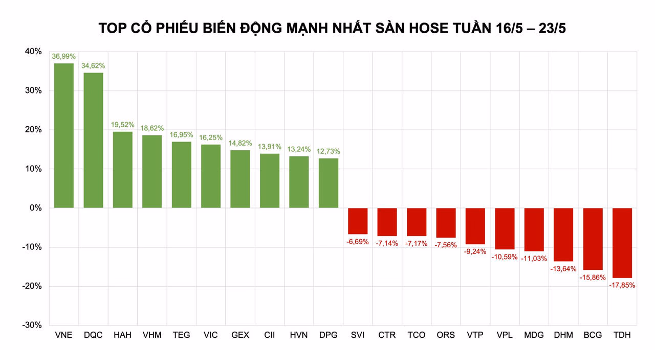 Trên sàn HoSE, top 10 cổ phiếu tăng mạnh nhất trong tuần qua ghi nhận sự góp mặt của: VNE (+36,99%), DQC (+34,62%), HAH (+19,52%), VHM (+18,62%), TEG (+16,95%), VIC (+16,25%), GEX (+14,82%), CII (+13,91%), HVN (+13,24%), DPG (12,75%).