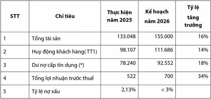 Năm 2026, BVBank đặt mục tiêu tổng tài sản tăng 16%, huy động khách hàng TT1 tăng 14%, dư nợ cấp tín dụng tăng 18% và lợi nhuận trước thuế tăng 34%.