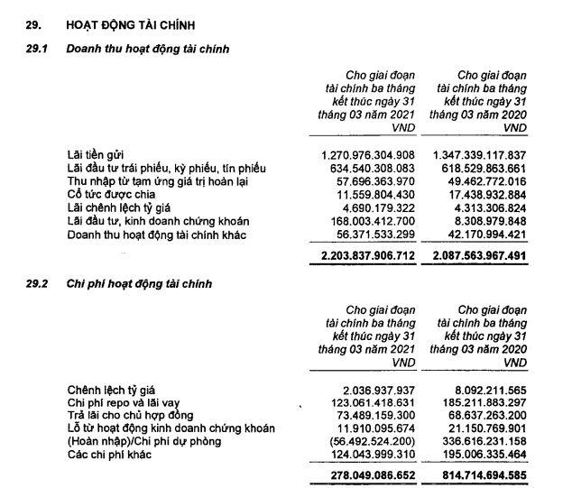Bù lại, lợi nhuận từ hoạt động tài chính tăng 51% so với quý 1/2020, lên gần 1.926 tỷ đồng nhờ doanh thu hoạt động tài chính tăng 6% trong khi chi phí tài chính giảm 66%. Trong đó, doanh thu tài chính chủ yếu là lãi tiền gửi có kỳ hạn đạt gần 1.271 tỷ đồng, giảm 6% và lãi từ đầu tư, kinh doanh chứng khoán hơn 168 tỷ đồng, gấp hơn 20 lần cùng kỳ.