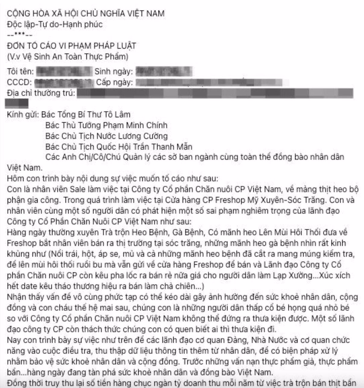 Trước đó, một cá nhân tự nhận là nhân viên C.P. đã đăng tải bài viết tố cáo công ty tại cửa hàng Fresh Shop Mỹ Xuyên (Sóc Trăng) thường xuyên bán thịt heo, gà bệnh, heo bốc mùi, xúc xích hết hạn được tháo nhãn để làm chả chiên. Người này còn cho rằng hành vi này mang lại lợi nhuận “hàng chục ngàn tỷ mỗi năm”.