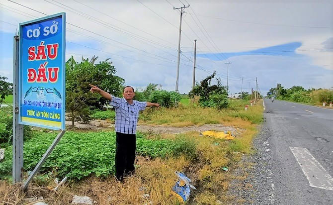 Ông Nguyễn Văn Đấu - Chủ cơ sở tôm giống Sáu Đấu chỉ về các thửa đất đã chuyển nhượng cho vợ chồng bà Mai nhưng chưa lấy được tiền.