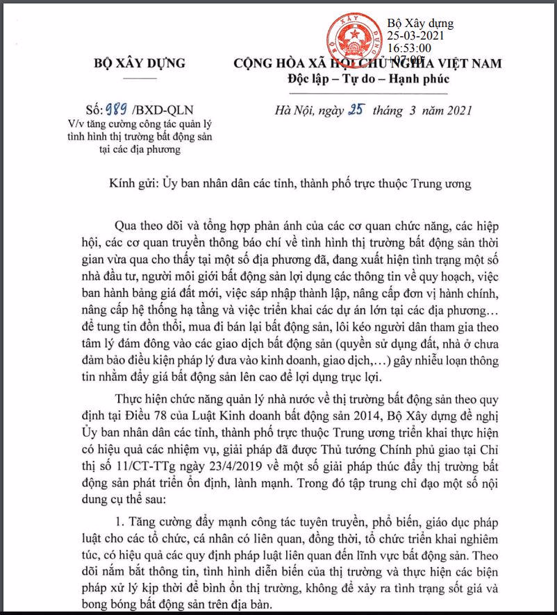 Theo công văn số 989/BXD-QLN của Bộ Xây dựng ban hành ngày 25/3/2021 về việc tăng cường công tác quản lý tình hình thị trường bất động sản tại các địa phương, Bộ Xây dựng cho biết, thời gian gần đây, một số địa phương đã và đang xuất hiện tình trạng một số nhà đầu tư, người môi giới bất động sản lợi dụng các thông tin về quy hoạch, việc ban hành bảng giá đất mới, việc sáp nhập thành lập, nâng cấp đơn vị hành chính, nâng cấp hệ thống hạ tầng và việc triển khai các dự án lớn,... để tung tin đồn thổi, mua đi bán lại bất động sản.