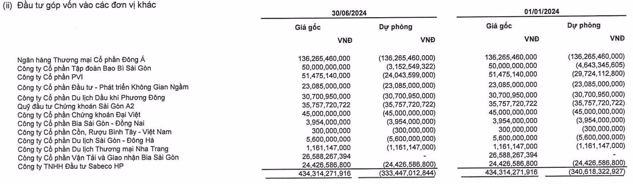 Đáng chú ý, một số khoản đầu tư đang phải trích lập dự phòng gần như toàn bộ, đơn cử như khoản đầu tư vào Ngân hàng TMCP Đông Á (trích lập dự phòng 100%), Công ty Cổ phần PVI (trích lập dự phòng hơn 46%), Công ty Chứng khoán Đại Việt (trích lập dự phòng 100%),… Tổng cộng, Sabeco đang trích lập dự phòng đầu tư tài chính dài hạn hơn 409 tỷ đồng.