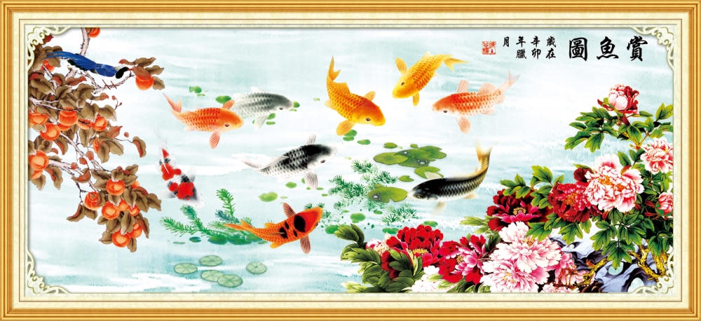Tranh cửu ngư quần hội miêu tả một đàn 9 con cá chép đang vui vẻ bơi lội. “Cửu” mang nghĩa vĩnh cửu, bền lâu; “ngư” có ý vạn sự như ý; cả bức tranh ngụ ý như ý cát tường. Hơn nữa, trong phong thủy, cá màu đỏ còn có thể vượng vận, cho nên treo một bức Cửu ngư quần hội có thể vượng vận khí của người trong gia đình.
