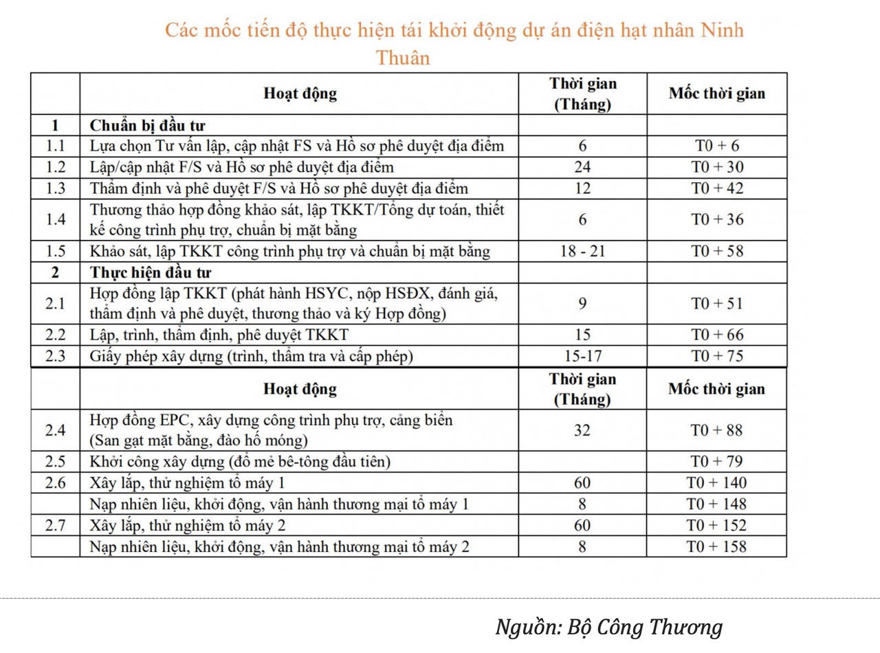 Việc tái khởi động dự án điện hạt nhân Ninh Thuận sẽ cần nhiều bước và mất khoảng 148 tháng (hơn 12 năm) để hoàn tất việc nạp nhiên liệu, khởi động và vận hành tổ máy đầu tiên. Để vận hành tổ máy thứ hai, cần thêm 10 tháng nữa, tức tổng thời gian khoảng 158 tháng.