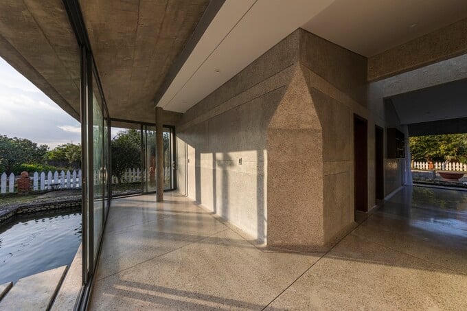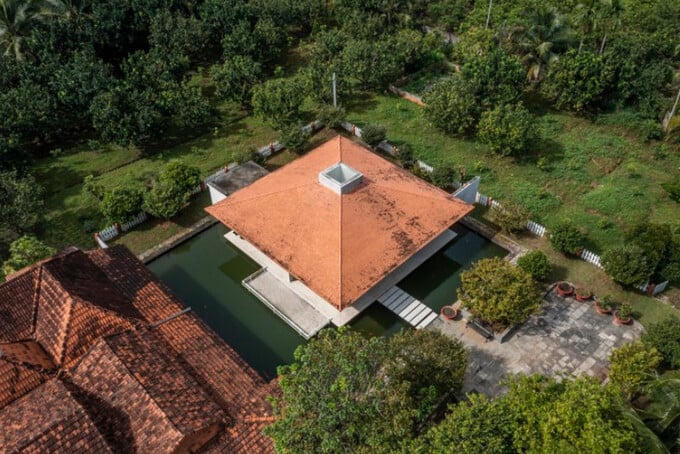 Kiến trúc sư thiết kế hệ thống mái thấp, tạo cảm giác bồng bềnh trên mặt nước, với tỷ lệ được cân nhắc kỹ lưỡng, tạo vùng bóng mát cho phần hiên xung quanh nhà. Khi ánh sáng mặt trời phản chiếu xuống mặt nước sẽ tạo ra một vũ điệu đầy mê hoặc của những bóng tối sống động, làm tăng thêm vẻ quyến rũ của căn nhà.