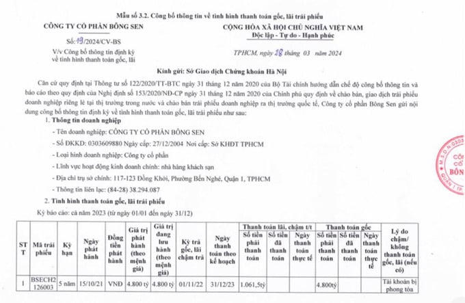 Tính tới hết năm 2023, tổng số tiền lãi vay và lãi chậm thanh toán của Công ty Cổ phần Bông Sen là hơn 1.060 tỷ đồng cho lô trái phiếu BSECH2126003 trị giá 4.800 tỷ đồng, đây là lô trái phiếu được phát hành ngày 15/10/2021 và đáo hạn ngày 15/10/2026, với lãi suất 10,5%/năm. Lý giải việc chậm trả lãi, phía Bông Sen cho biết do “tài khoản bị phong tỏa”.