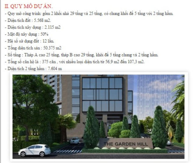 Được biết, dự án Garden Hill (số 99 phố Trần Bình, phường Mỹ Đình 2, quận Nam Từ Liêm, Hà Nội) là dự án hỗn hợp Văn phòng, Trung tâm thương mại và Căn hộ cao cấp. Dự án có tổng diện tích đất 5.568m2. Trong đó, diện tích xây dựng 2.155m2.