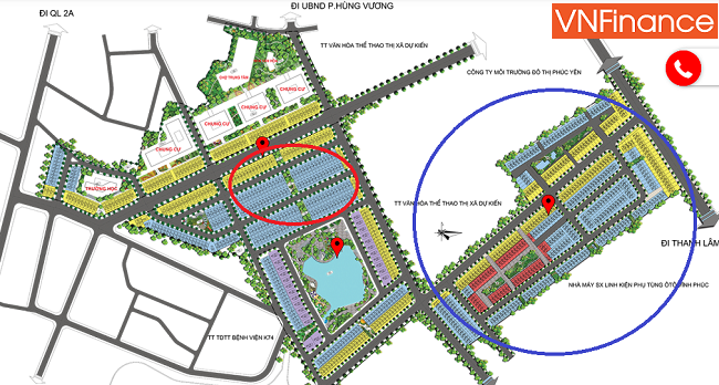 Theo giới thiệu của nhân viên môi giới, giai đoạn 1 - phần dự án trong vòng tròn mầu xanh, chủ đầu tư đã bán hết, nhưng mới đang làm hạ tầng và chưa hoàn thiện. Trong khi đó, khu vực mầu đỏ, là giai đoạn 2, đang được đơn vị phân phối chào bán, vẫn còn hoang sơ và chưa có hạ tầng.