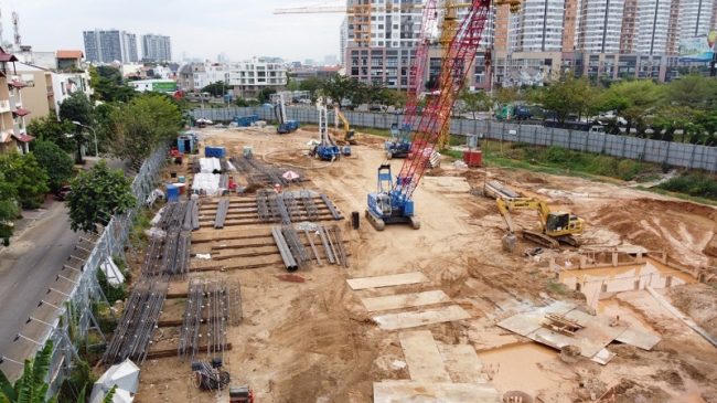 Giữa trung tâm thành phố Thủ Đức, Rome by Diamond Lotus nổi bật bởi những chiếc cẩu dài phía trong hàng rào tôn, khác với những tòa nhà cao tầng đã xây xong bên cạnh.