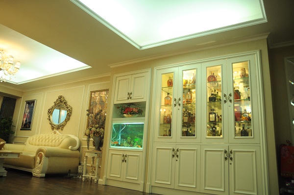 Tủ rượu và bể cá được thiết kế với màu gam màu trắng
