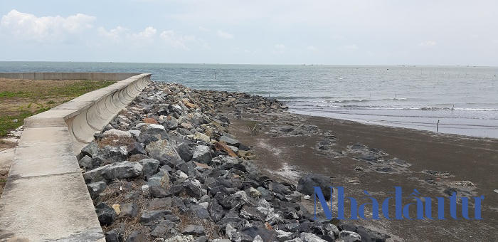 Ngay cận biển là bức tường chắn bao quanh dự án với hàng ngàn khối đá kiên cố được san lấp, công trình khởi công vào năm 2012, cũng chính việc san lấp này đã khiến nhiều hộ dân tại đây mất đi công ăn việc làm. Ảnh: Chu Ký
