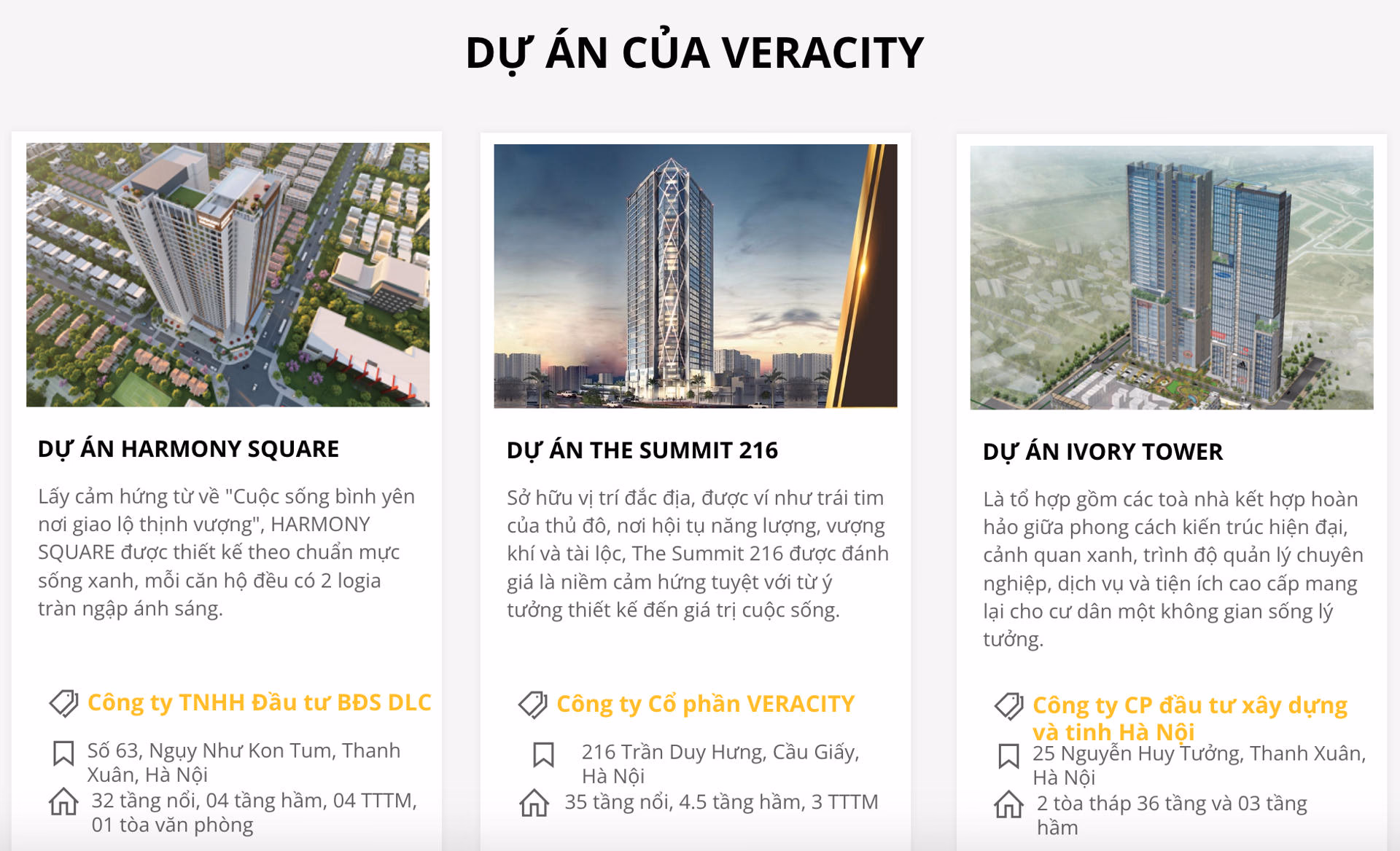 Ngoài dự án The Summit – 216 Trần Duy Hưng chậm bàn giao, Veracity còn được cho là đơn vị phát triển của dự án Harmony Square, dự án được quảng cáo là bốn mặt tiền “độc nhất vô nhị” giữa đất vàng quận Thanh Xuân.