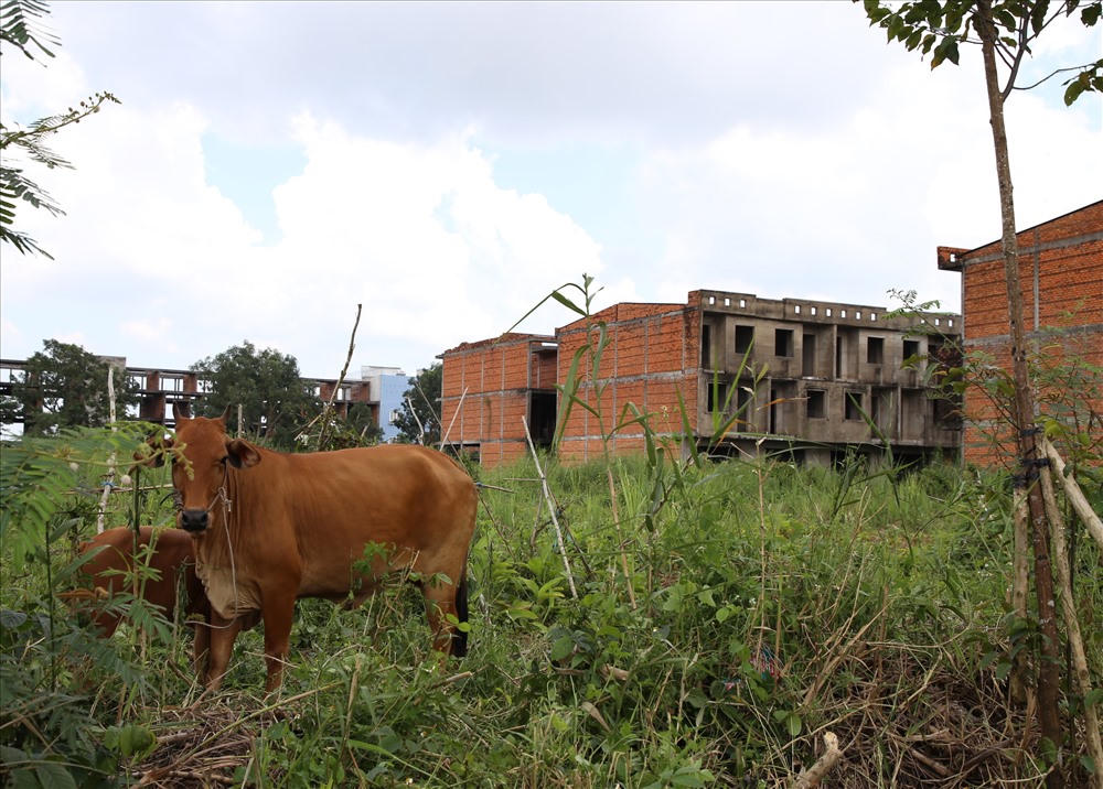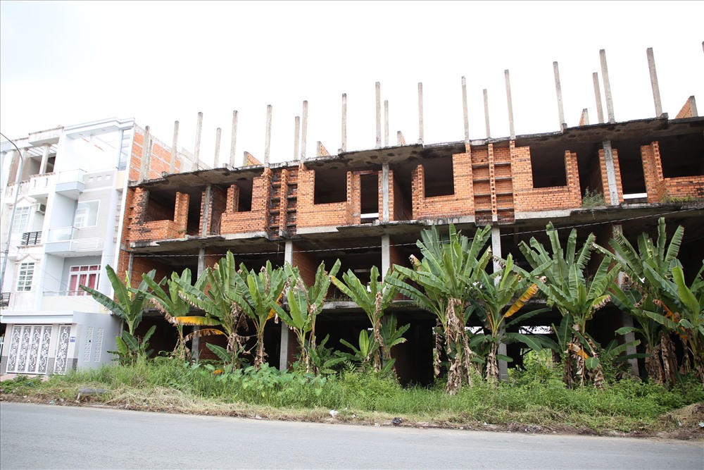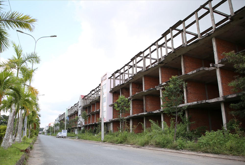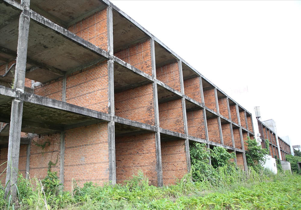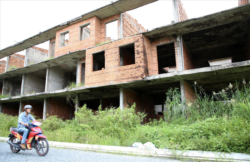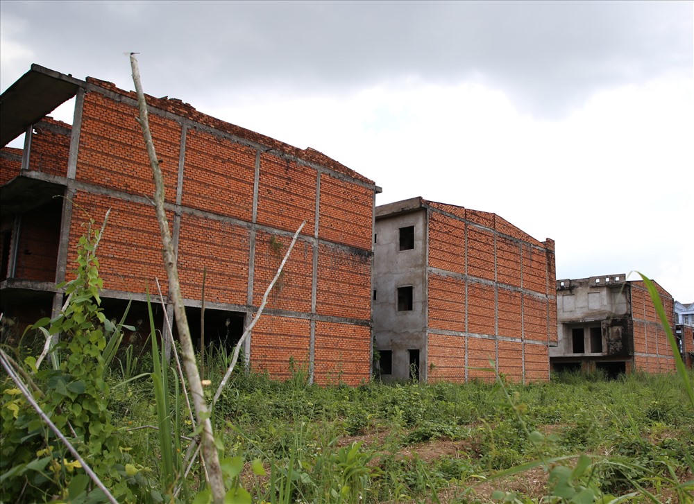 Chủ đầu tư khu dân cư chỉ mới xây dựng được phần thô, rồi để vậy phơi sương phơi nắng. Ảnh: H.Thơ