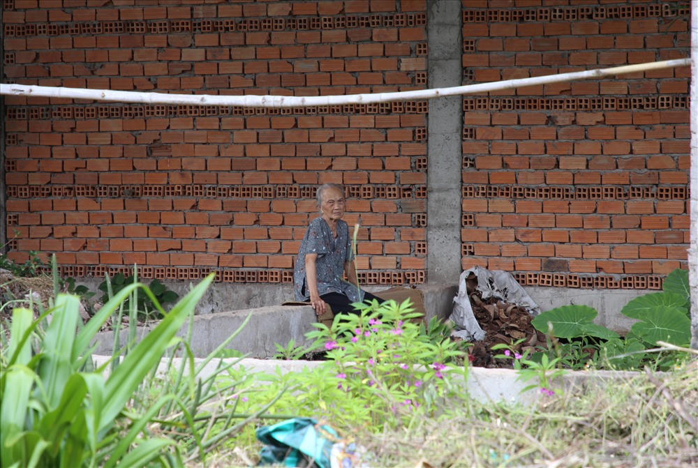 Một người già nghỉ ở dãy nhà bỏ hoang, xung quanh là những bức tường nham nhở. Ảnh: Tr.Lưu.