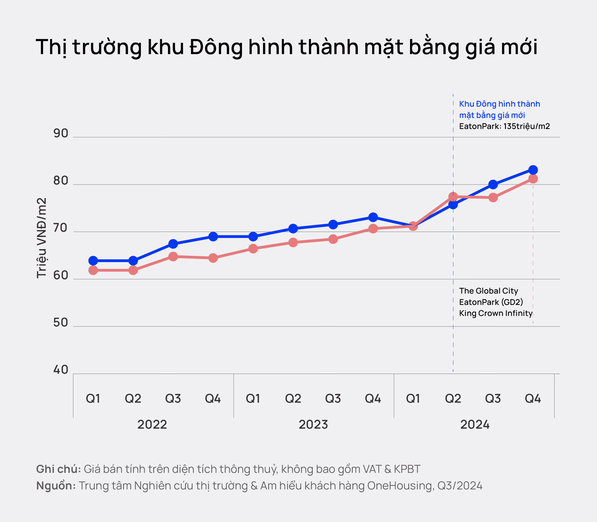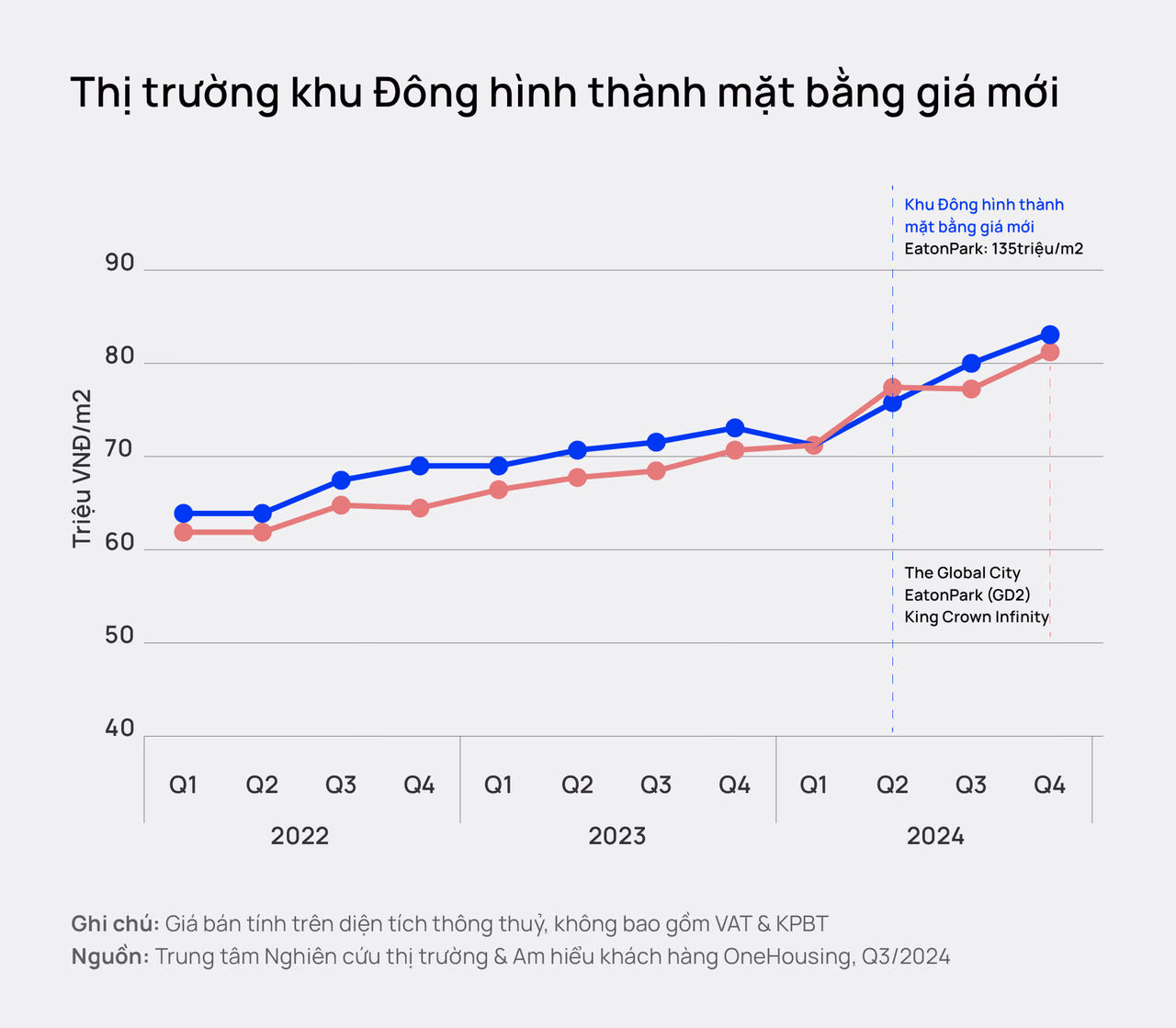 Dù giá neo cao nhưng OneHousing nhận định thị trường bất động sản TP. HCM đang cho thấy dấu hiệu phục hồi mạnh mẽ về cả nguồn cung và lượng tiêu thụ, với tâm điểm là khu Đông, đặc biệt là quận 2 (cũ). Sự thành công của các dự án mới như Masteri Grand View (hơn 2.500 lượt đặt mua sớm) và Eaton Park (hơn 1.300 lượt đặt mua) đã tạo nên một cú hích đáng kể cho thị trường.