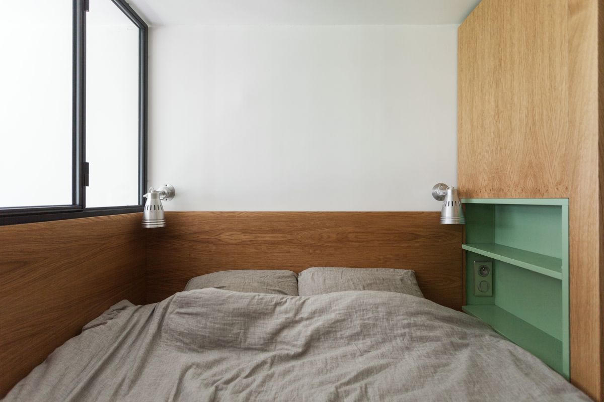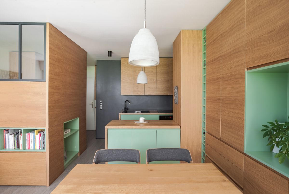 Các bức tường đều được thiết kế hệ thống kệ, tủ linh hoạt, kết hợp màu gỗ sồi cùng với màu xanh lá cây. Căn phòng được thiết kế và trang trí khéo léo để tăng tính thẩm mỹ, đồng thời tạo không gian rộng rãi dù căn hộ hạn chế về diện tích.