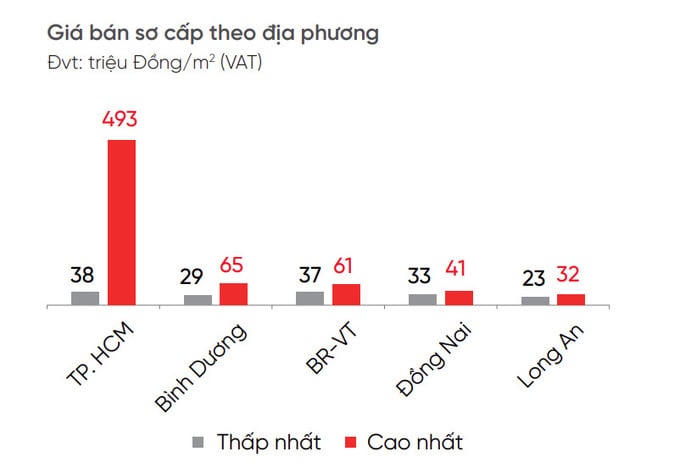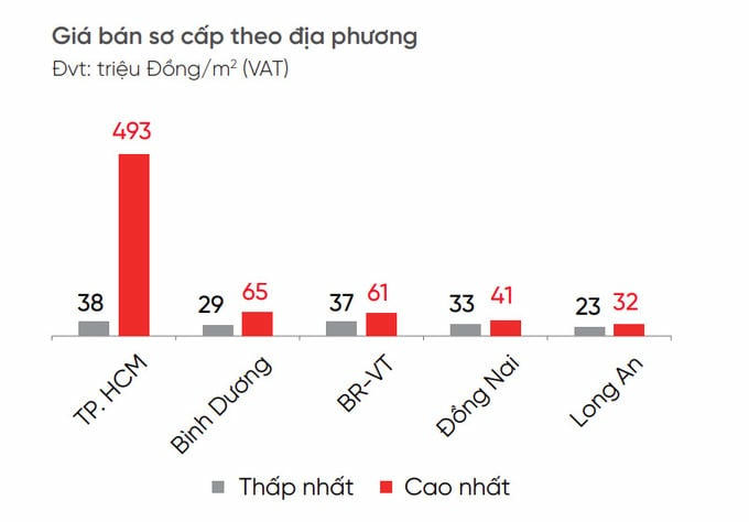 Tại TP.HCM, giá bán sơ cấp cao nhất lên tới 493 triệu đồng/m2, thấp nhất 38 triệu đồng/m2; Bình Dương cao nhất 65 triệu đồng/m2, thấp nhất 29 triệu đồng/m2; Bà Rịa - Vũng Tàu cao nhất 61 triệu đồng/m2, thấp nhất 37 triệu đồng/m2; Đồng Nai cao nhất 41 triệu đồng/m2, thấp nhất 37 triệu đồng/m2; Long An cao nhất 32 triệu đồng/m2, thấp nhất 23 triệu đồng/m2.
