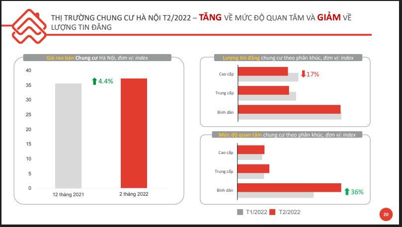 Xét theo từng phân khúc, lượng tin đăng phân khúc căn hộ cao cấp và trung cấp giảm 17%, còn phân khúc bình dân đi ngang so với tháng trước đó. Trong khi đó, giá rao bán chung cư ở Hà Nội tăng 4,4% trong tháng 2/2022.