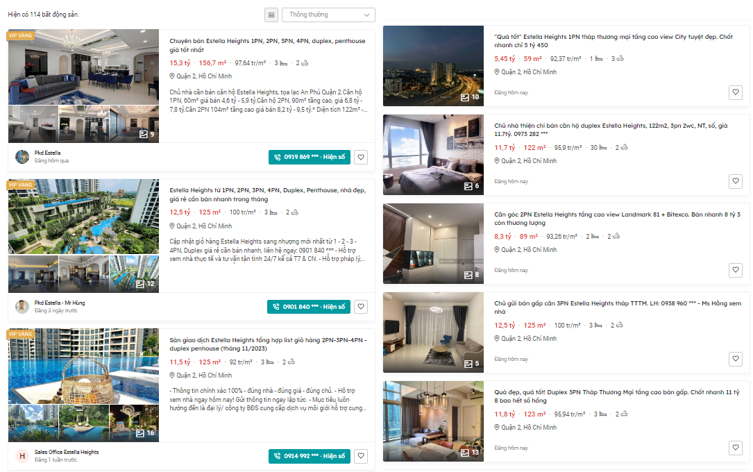 Việc tăng giá nhà chung cư cũ đã qua sử dụng không chỉ diễn ra với các dự án có giá bình dân. Ghi nhận tại một số dự án tại cao cấp, nhiều căn hộ cũng đã tăng giá, thậm chí là gấp nhiều so với giá sơ cấp dù qua sử dụng từ 6-8 năm. Đơn cử như tại dự án Estella Heights, từng có giá mở bán khoảng 36 triệu/m2, nhưng trong thời gian gần đây, nhiều bài đăng trên các chợ bất động sản cho thấy căn hộ 180m2 đang được rao bán với giá hơn 100 triệu đồng/m2.