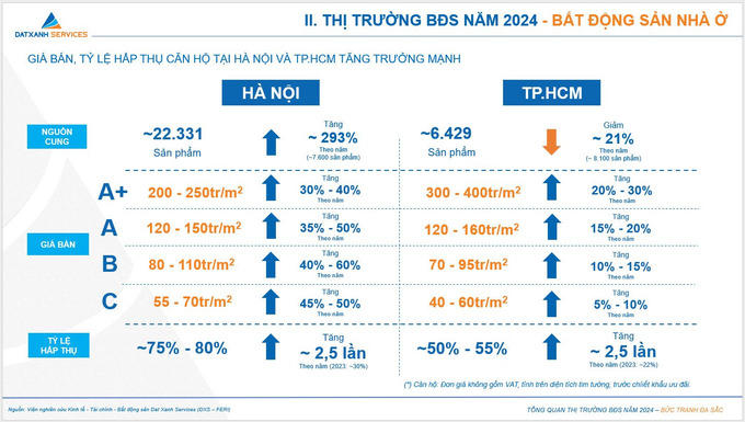 Theo báo cáo nghiên cứu thị trường 2024 và dự báo thị trường 2025 của Viện nghiên cứu Kinh tế - Tài chính - Bất động sản Dat Xanh Services (DXS-FERI), trong năm 2024, giá bán, tỷ lệ hấp thụ căn hộ tại Hà Nội và TP HCM tăng trưởng mạnh.
