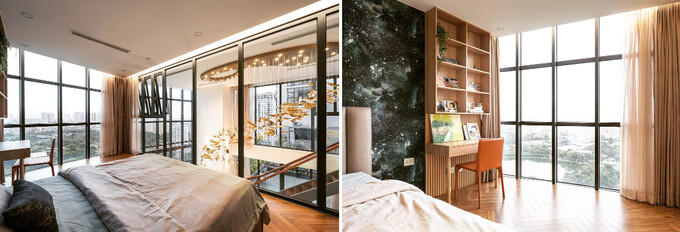 Các cửa sổ và cửa ra vào được thiết kế rộng rãi, giúp ánh sáng tự nhiên có thể tràn vào phòng, giúp không gian sống trong căn hộ thông tầng trở nên sáng sủa và tươi mới.