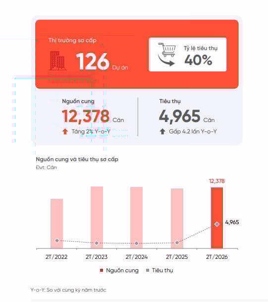 Theo báo cáo 2 tháng đầu năm 2026 của DKRA Consulting, có 126 dự án trên thị trường sơ cấp (chủ đầu tư mở bán), tổng nguồn cung căn hộ đạt 12.378 căn, tăng nhẹ 2% so với cùng kỳ năm 2025.
