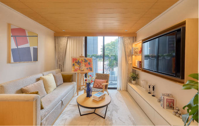 Chủ nhà có thể chọn gói nội thất hoàn thiện của chủ đầu tư hoặc tự do sáng tạo bài trí. Những chiếc sofa giường đa năng, bàn trà hiện đại, và không gian tường trang trí tệp với màu sắc căn hộ sẽ đem đến trải nghiệm thư giãn tuyệt đối sau giờ làm việc. Người trẻ sống 1 mình hay vợ chồng mới cưới có đủ không gian thoải mái sinh hoạt, đồng thời tận hưởng từng góc nhỏ nghệ thuật đầy cá tính.