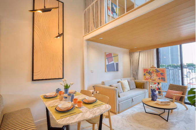 Diện tích căn hộ có đủ các khu vực chức năng cần thiết như bếp và bàn ăn riêng, khu vực tiếp khách và nhiều không gian ngủ. Phòng ngủ chính vẫn được đặt “bên trên tầng lầu”, không gian chức năng cũng có thể sắp xếp thành phòng giải trí hoặc phòng học.