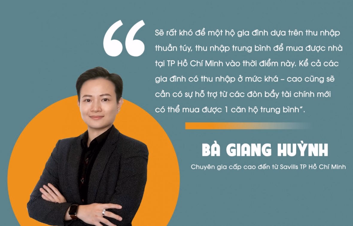 Cụ thể, thống kê của Savills Việt Nam cho biết, giá bán trung bình của phân khúc căn hộ chung cư tại TP Hồ Chí Minh đang neo ở mức 125 triệu đồng/m2, tăng 44% theo năm. Bà Giang Huỳnh, Chuyên gia cấp cao đến từ Savills TP Hồ Chí Minh nhận xét, giá căn hộ hiện nay chênh lệch đến khoảng 30 lần so với mức thu nhập trung bình của người dân thành phố.