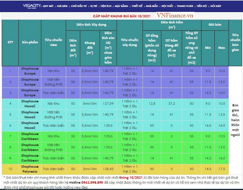 Theo các thông tin rao bán trên một số website, Shophouse Vega City view mặt biển có mức giá trung bình 15 tỷ đồng; căn view mặt đường Phạm Văn Đồng có mức giá trung bình 12,5 tỷ đồng; View nội khu có mức giá trung bình 9 tỷ đồng.