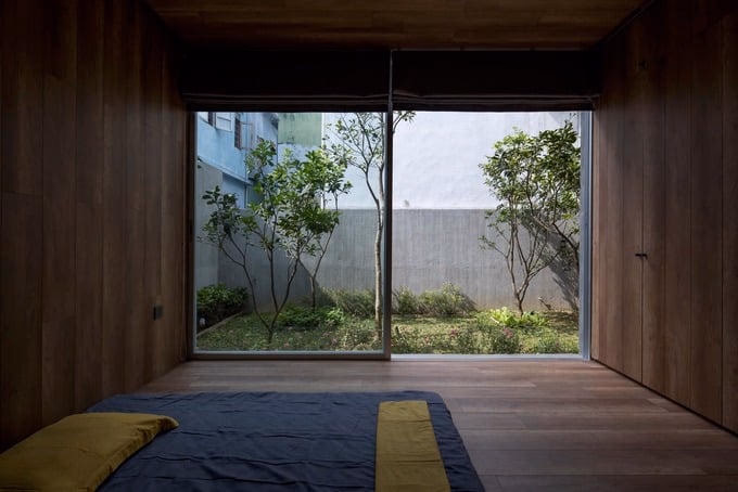 Giữa 2 bên là sân vườn và ao cá, phòng ăn mở giúp thông gió mát mẻ vào mùa hè từ hướng Đông và Đông Nam khắp toàn bộ tòa nhà. Bên cạnh đó, một phòng ngủ tiếp xúc trực tiếp với khu vườn sẽ là nơi cả nhà ngủ ở đây khi bà ngoại từ Huế về thăm.